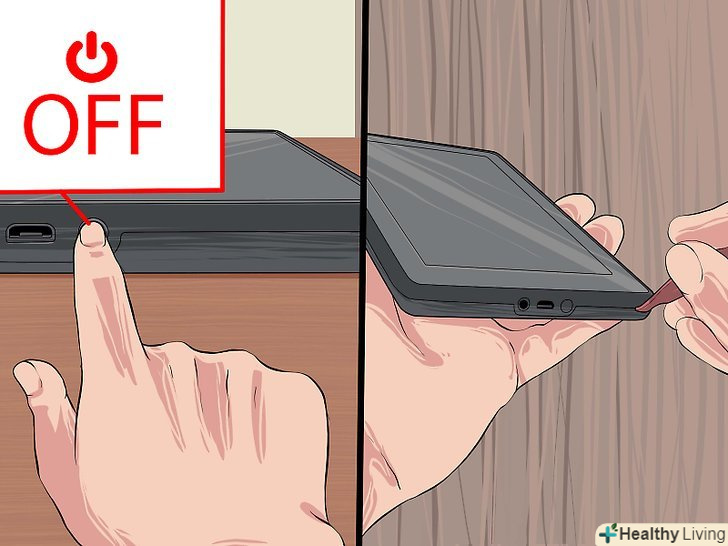 М'яке перезавантаження Kindle першого покоління.вимкніть пристрій, відкрийте кришку на задній панелі і вийміть акумулятор. Зачекайте одну хвилину, вставте акумулятор і включіть пристрій.[7][8]- Для вилучення акумулятора з пристрою скористайтеся невеликим загостреним предметом (наприклад, ручкою) або зробіть це за допомогою нігтів. Не використовуйте ножиці або ніж — цими предметами можна пошкодити акумулятор.
