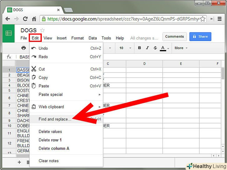 - Випадаюче меню: натисніть на вкладку "редагувати" в випадаючому меню. Прокрутіть нижче, щоб знайти пункт " Знайти і замінити».