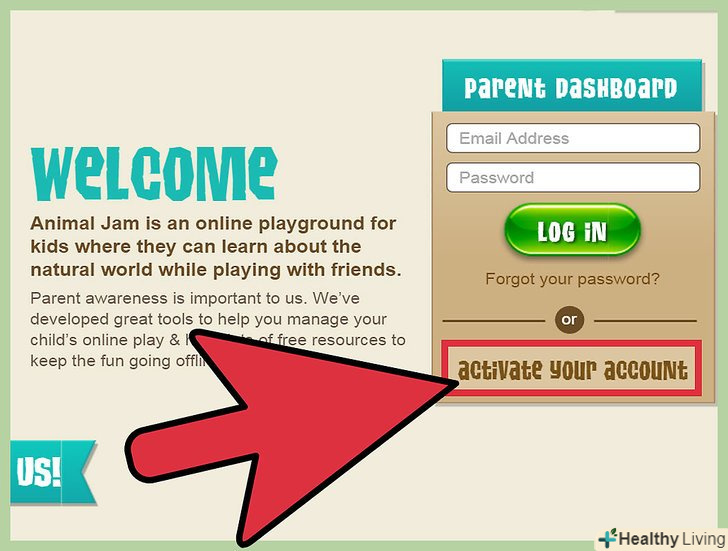 Активуйте батьківський аккаунт. при створенні нового аккаунта на Animal Jam від вас зажадають вказати адресу електронної пошти батьків, через яку буде здійснюватися зворотний зв'язок, Налаштування аккаунта, а також платіжні дані. Щоб активувати обліковий запис: [3]- Відкрийте батьківського контролю і виберіть " Activate Your Account "(активувати аккаунт).
