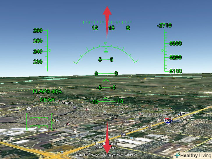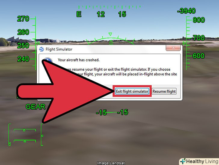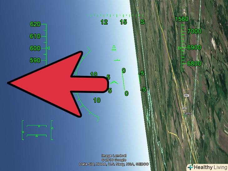 Познайомтеся з табло.- Циферблат нагорі показує швидкість у вузлах. Поруч нагорі розташовується пристрій, що відображає ваш курс. Праворуч ви побачите маленьку кнопку, на якій написано «вийти з симулятора польотів». Натисніть на неї, якщо ви хочете повністю вийти з симулятора. Нижче розташовується цифра 0. Дана цифра відображає вертикальну швидкість. Іноді ця цифра буде негативною, що означає, що ви знижуєтеся.