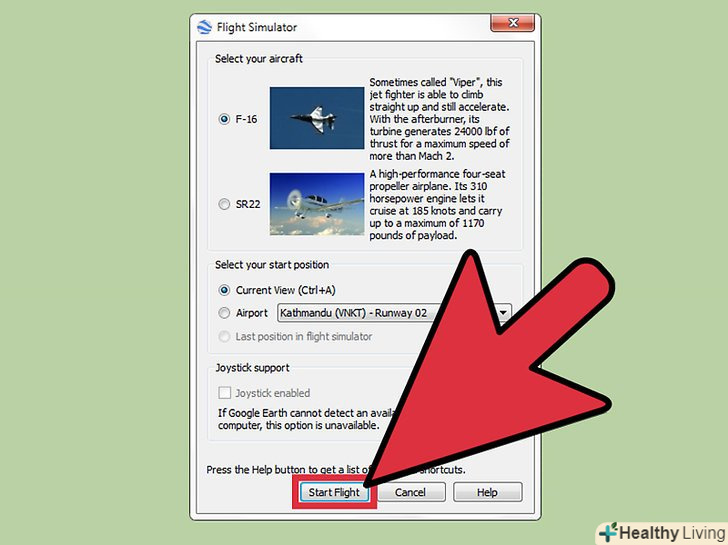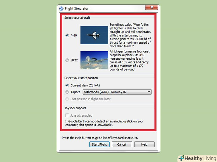 Встановіть особисті налаштування.у вас повинно відкритися маленьке вікно, яке складається з трьох частин: тип повітряного судна, стартова позиція і джойстик.- Повітряне судно. Виберіть літак, на якому вам би хотілося відправитися в політ. SR22 літає повільніше і легше в управлінні, а значить добре підійде новачкам. F - 16 підійде досвідченим користувачам. У цьому посібнику ми використовуємо як приклад F-16.