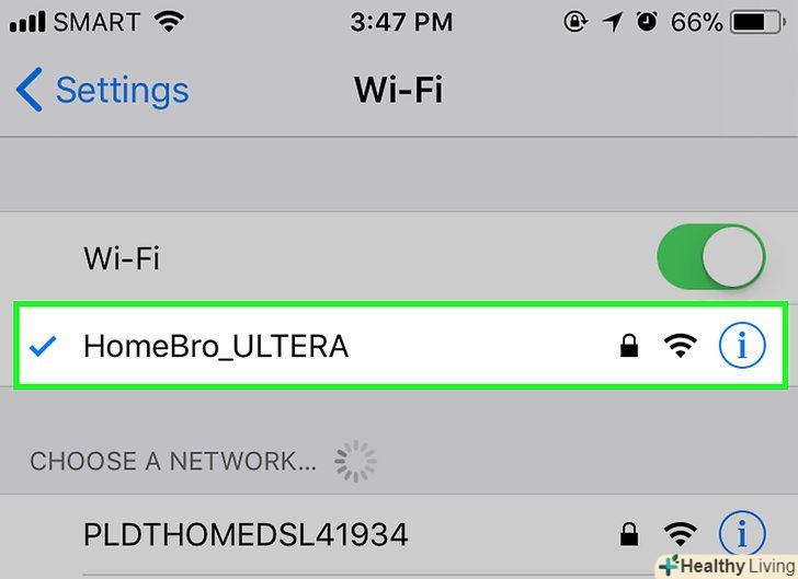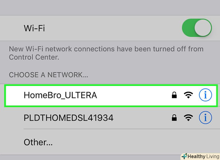 Знайдіть назву своєї мережі Wi-Fi. Маршрутизатор для широкосмугової мережі має назву за замовчуванням, яке вказується на корпусі. Назва мережевої точки доступу часто виглядає як назва вашого мобільного пристрою (наприклад "iPhone [ваше ім'я]"). Знайдіть і виберіть цю назву.- Назву мережі Wi-Fi або точки доступу можна змінити. Якщо Ви змінювали назву, то воно точно буде вам відомо. Якщо назву змінив інша людина, дізнайтеся назву у власника мережі.