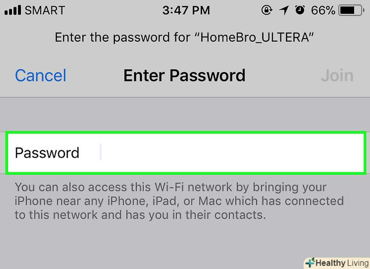 Введіть пароль мережі або точки доступу. найчастіше мережі недоступні для загального користування. Якщо мережеве підключення захищене паролем, то вам буде запропоновано ввести пароль, щоб підключитися до мережі. Пароль за замовчуванням зазвичай вказаний на маршрутизаторі. Якщо ви не знаєте пароль, то зверніться до власника мережі.- У деяких захищених мережах загального користування можуть бути різні паролі для різних людей. Наприклад, учні школи можуть підключатися до мережі за номером свого пропуску без єдиного пароля.