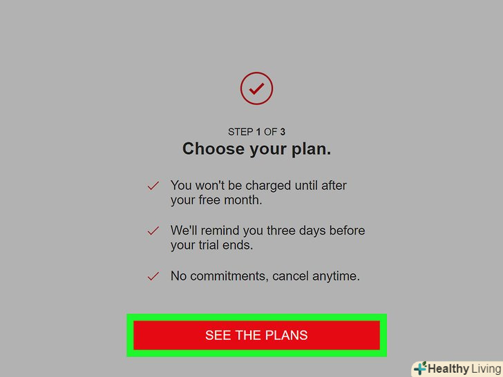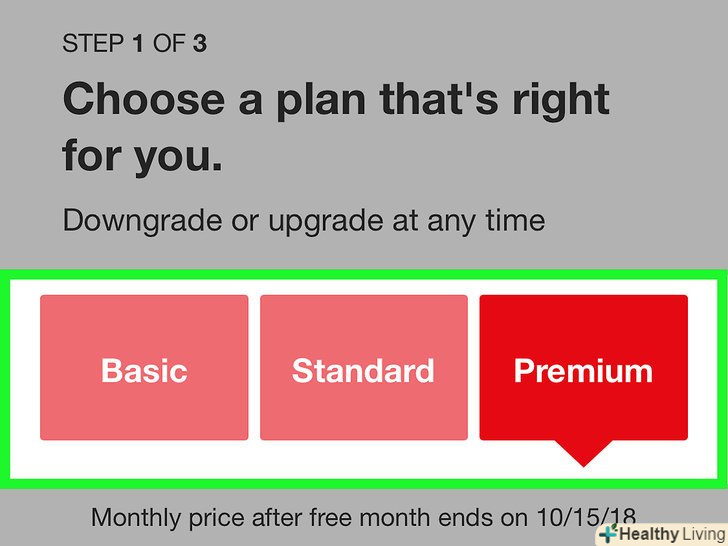 Натисніть " Join Free for a Month "(підписатися безкоштовно на місяць). відобразиться інформація про три тарифні плани; виберіть один з них:- " Basic "(основний): цей недорогий план дозволить дивитися Netflix на одному пристрої. Виберіть "Basic", якщо Netflix будете дивитися тільки ви. Перегляд HD-відео в цей план не входить.