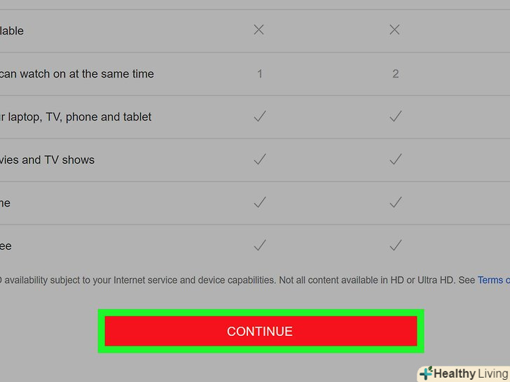 Виберіть тарифний план і натисніть «Continue» (Продовжити). Netflix пропонує три тарифні плани:- «Basic» (основний): цей недорогий план дозволить дивитися Netflix на одному пристрої. Виберіть "Basic", якщо Netflix будете дивитися тільки ви. Перегляд HD-відео в цей план не входить.
