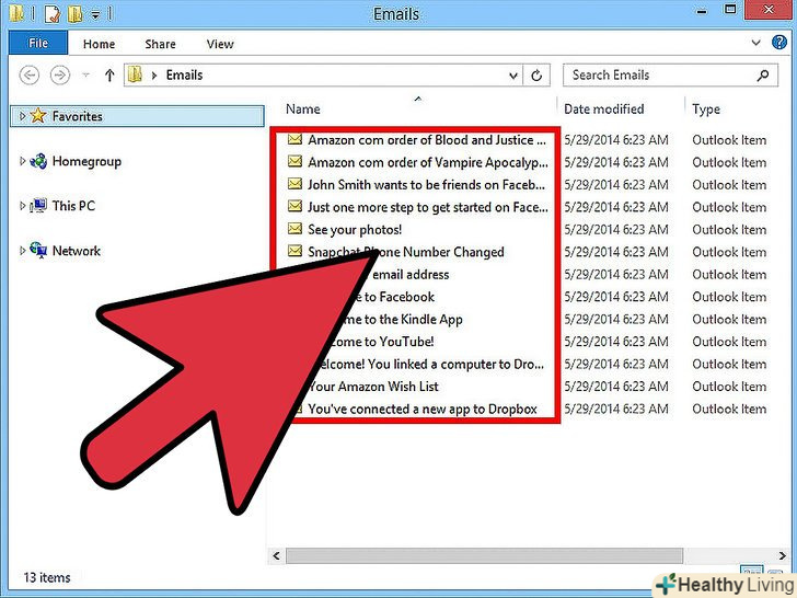 Виберіть Усі повідомлення, які хочете зберегти, і просто перетягніть їх у папку.- Вкладення також будуть включені, але їх можна буде відкрити тільки в Outlook, так як формат збережених файлів є власністю користувача електронної пошти.