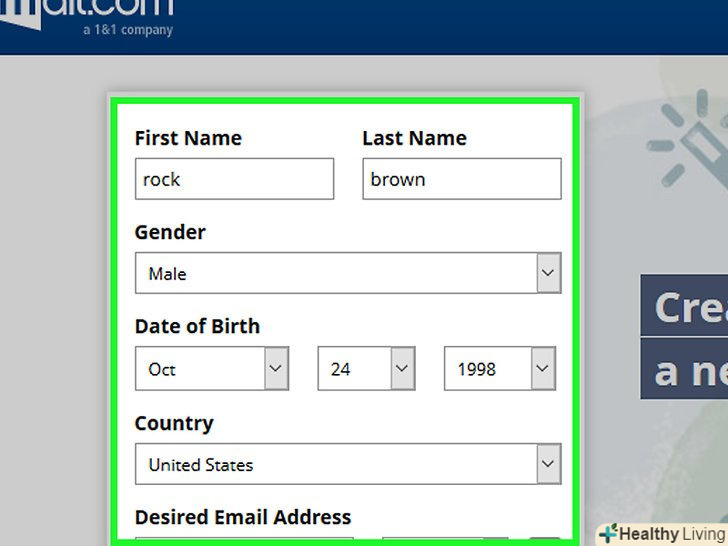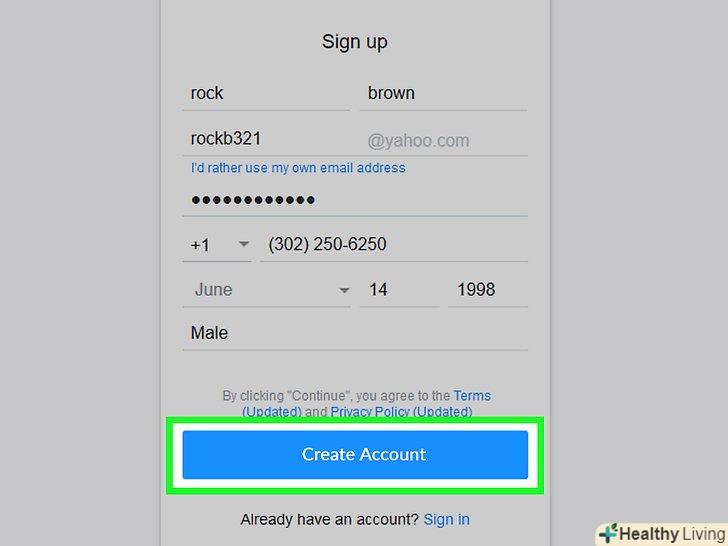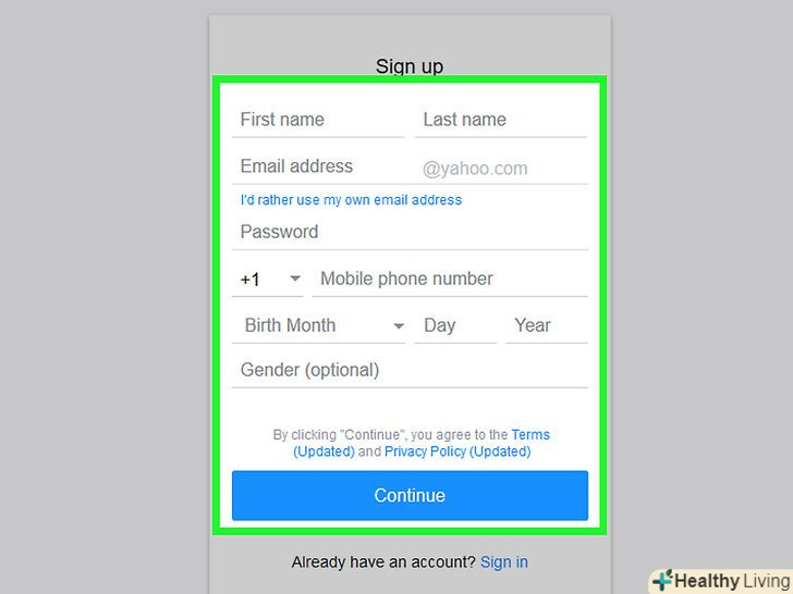 Заповніть всі поля на сторінці реєстрації Yahoo. потрібно буде вказати ім'я та прізвище, створити адресу електронної пошти та пароль, ввести дату народження, стать і номер мобільного телефону.