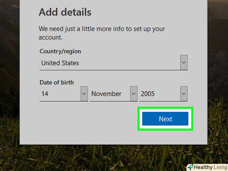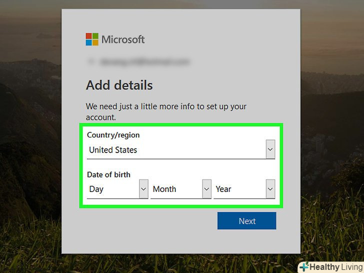 Заповніть інші поля на сторінці реєстрації Outlook. потрібно буде вказати пароль, Індекс, ввести дату народження, стать і номер телефону.