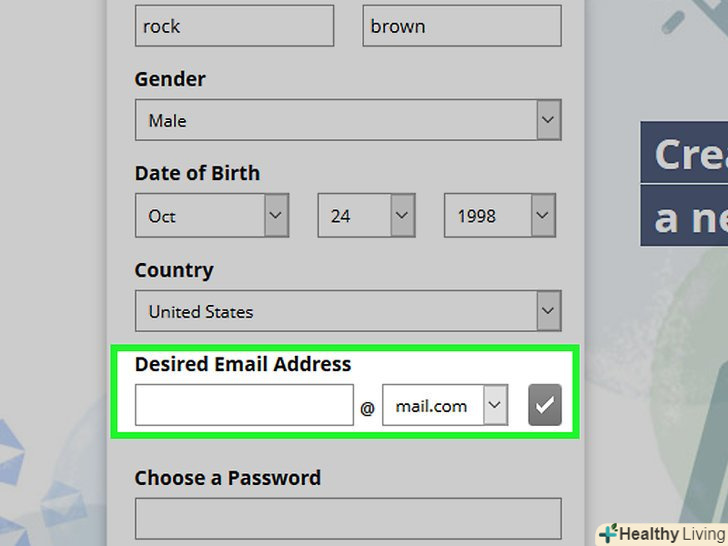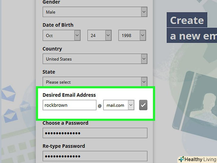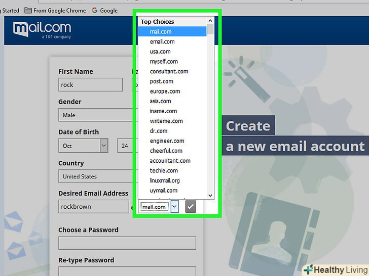 Виберіть тип поштового домену у випадаючому меню біля назви поштової скриньки. ви можете вибрати будь-який Поштовий домен, виходячи з особистих інтересів, наприклад "@mail.com, ""@cheerful.com ""@elvisfan.com " і так далі.
