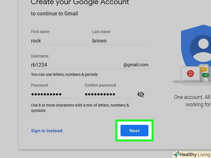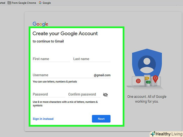 Заповніть необхідні поля на сторінці облікового запису Google. потрібно буде вказати ім'я та прізвище, створити адресу електронної пошти та пароль, а також дату народження, стать і номер мобільного телефону.
