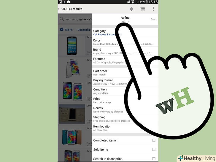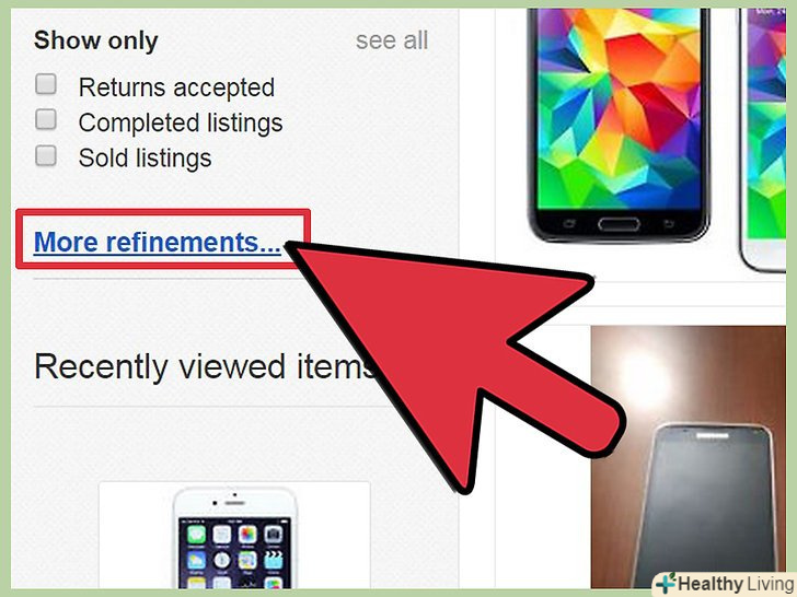 Використовуйте інші фільтри. ви можете ще більше відфільтрувати результати, натиснувши на опцію "More Options" (додаткові параметри).- Ви можете встановити такі умови, як: «Price Range» (діапазон цін), «Location» (місцезнаходження), «Max Distance» (максимальна відстань), «Time Left» (залишився), «Number of Bids» (кількість ставок), «Free Shipping» (безкоштовна доставка), «Description Search» (пошук за описом), «Completed Listings» (завершені лоти) і «Sold Items Only» (тільки продані товари).