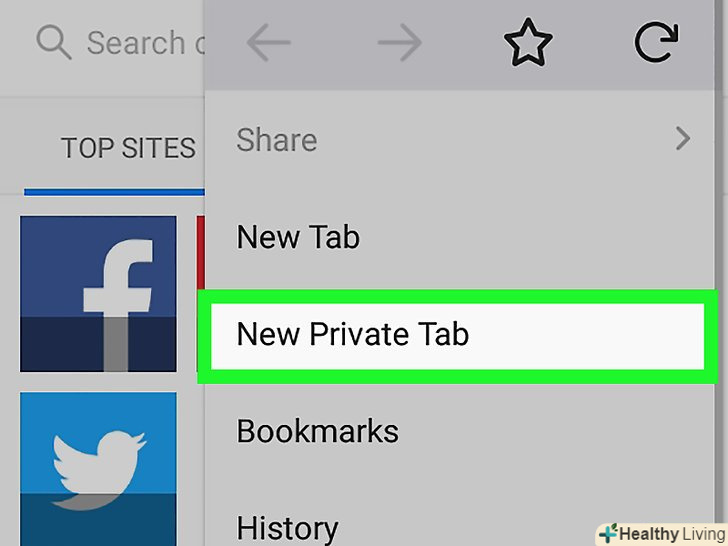 НатиснітьНова приватна вкладка . ви знайдете цю опцію вгорі меню. Відкриється нова приватна вкладка, на якій історія не зберігається.- Щоб перейти в звичайний режим, натисніть на значок у вигляді квадрата з числом в правому верхньому куті, а потім торкніться значка у вигляді капелюха в лівому верхньому кутку.