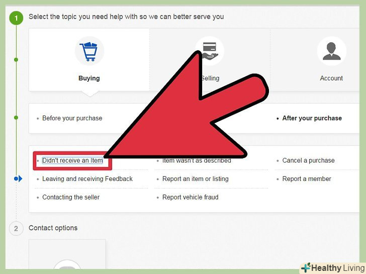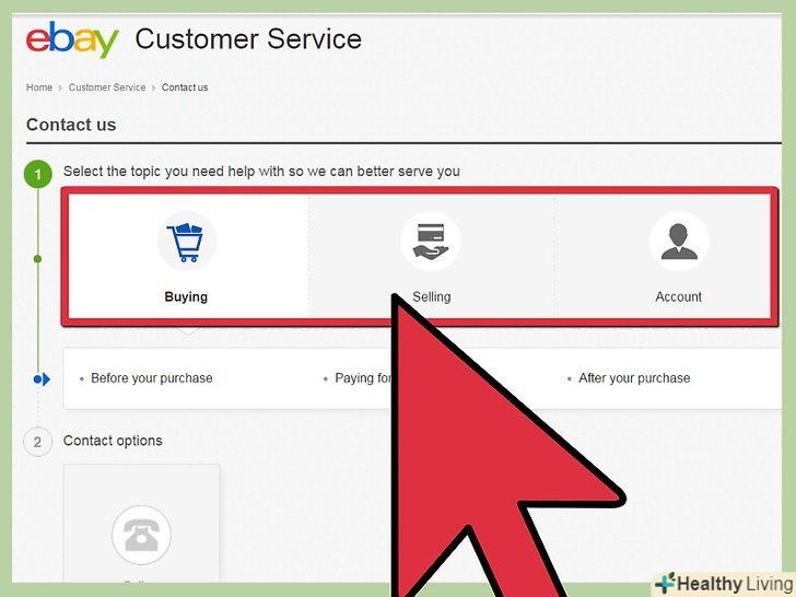 Виберіть категорію, яка найкраще описує вашу проблему. наприклад, Покупки (Buying), продажу (Selling), або Мій профіль (Account).