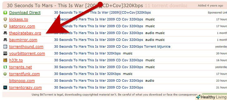 Знайдіть торрент трекер, який вам підходить. Ви можете завантажити торренти на безлічі сайтів. Вони називаються торрент трекерами. Деякі торрент трекери закриті, інші-загальнодоступні; деякі спеціалізуються тільки на музиці або відео. Пошукайте в Google той, який вам сподобається. Популярні торрент трекери: Rutracker, the Pirate Bay і кінозал.тв [1] .- Загальнодоступні торрент трекери: будь-хто може приєднатися і всі бачать ваші дії. Ці сайти часто перевіряються у зв'язку з недотриманням авторських прав. Щоб уникнути проблем із законом, поширюйте тільки ті файли, на поширення яких у вас є юридичне право.