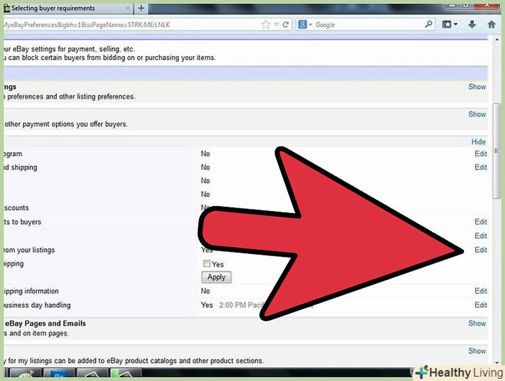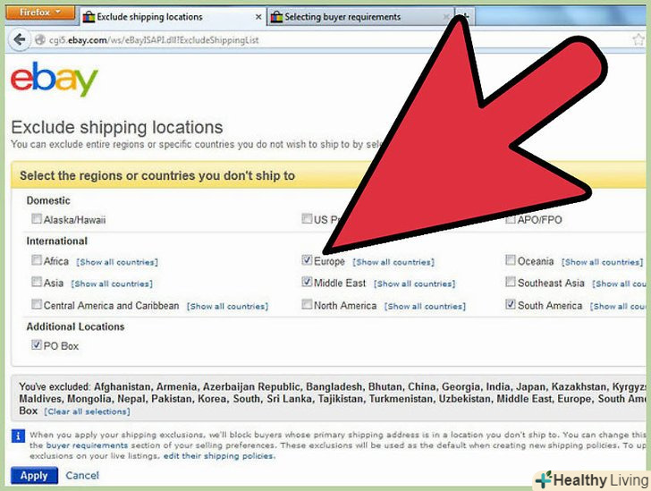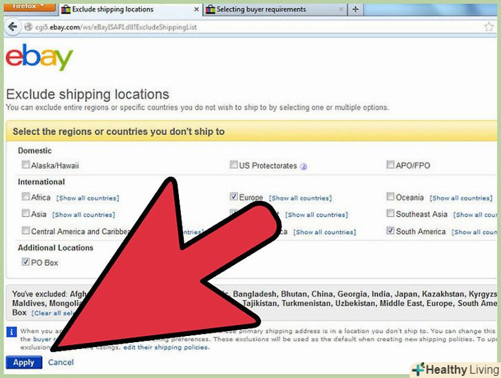 Натисніть "Apply", щоб зберегти ваші нові налаштування відправки товарів. користувачі, розташовані в країнах, які ви заблокували, більше не матимуть можливості купувати у вас або брати участь в торгах ваших товарів. [2] .- Щоб зміни увійшли в силу, поставте прапорець поруч з полем " Apply to all current live listings.”