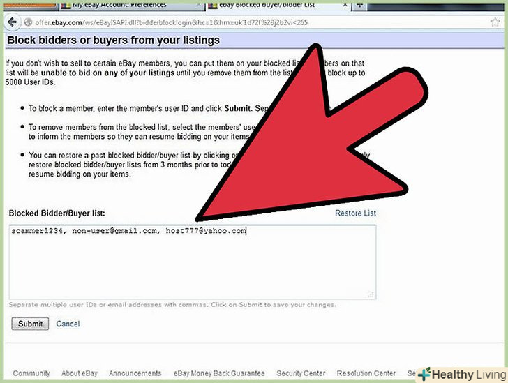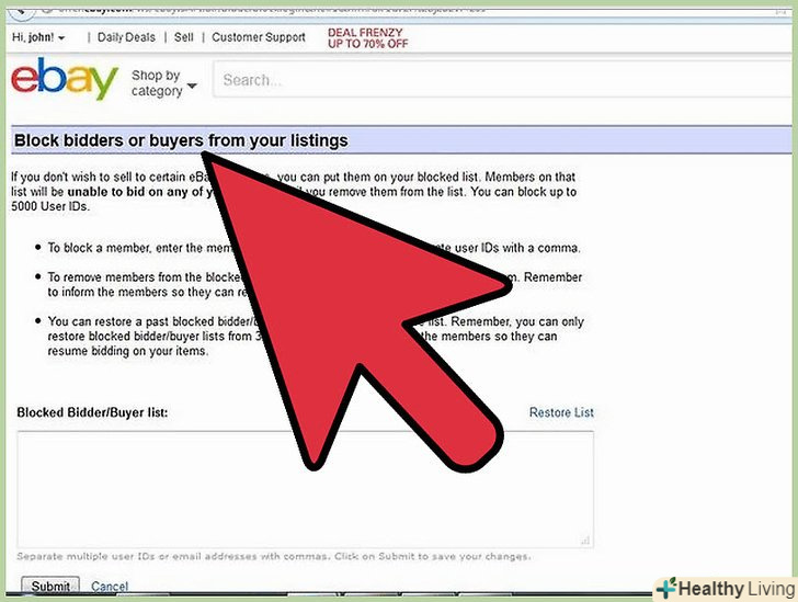 - Розблокуйте користувача eBay в будь-який час, повернувшись на сторінку eBay "Managing Bidding and Buyers", видаливши ім'я Користувача з заблокованого списку і натиснувши "Submit.”