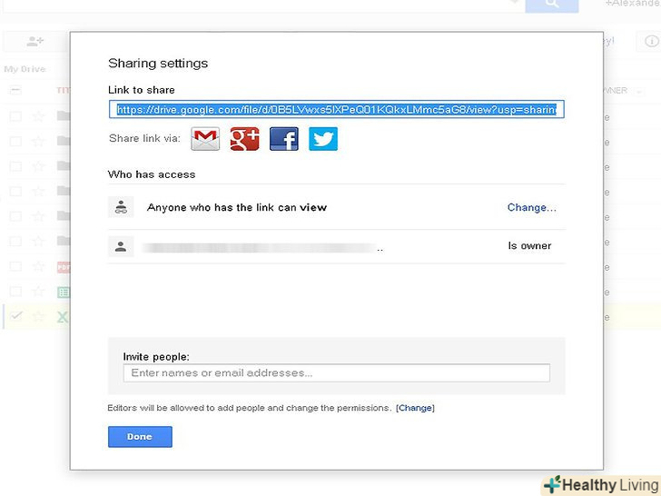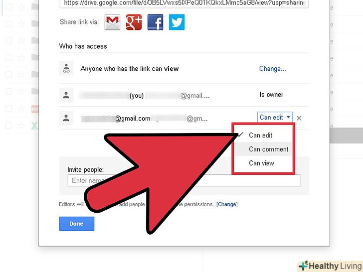 Встановіть рівень доступу для знову доданої електронної адреси, Виберіть з варіантів "може редагувати", "може коментувати"і" може переглядати".натисніть на "Готово".