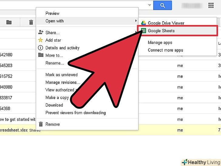 Ваша таблиця повинна бути налаштована таким чином, щоб її можна було відкрити за допомогою інструменту "Google Таблиці" і редагувати як електронну таблицю.- Щоб це зробити, клацніть правою кнопкою миші на файлі, виберіть "Відкрити за допомогою-gt;Google Таблиці".
