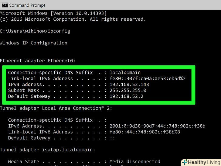 Введіть ipconfig . ця команда відобразить IP-адресу Вашого комп'ютера.