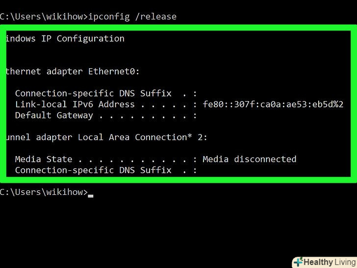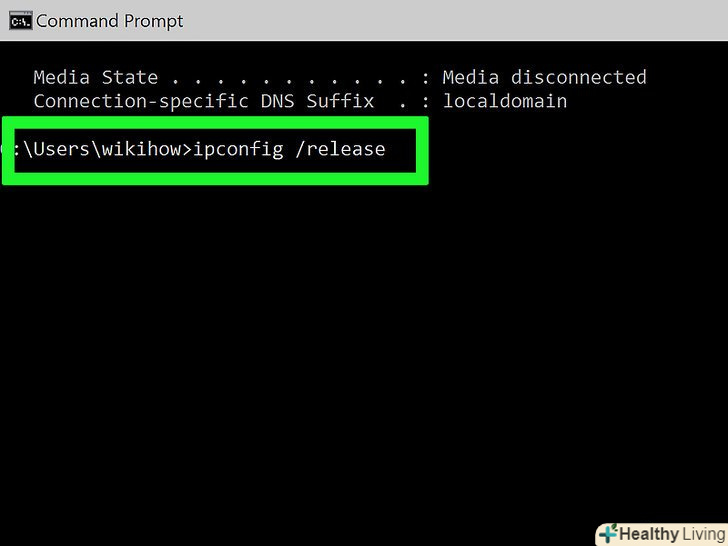 Введіть команду "release". введіть ipconfig /release і натисніть ↵ Enter . Поточний IP-адреса буде видалений, а комп'ютер відключиться від інтернету.