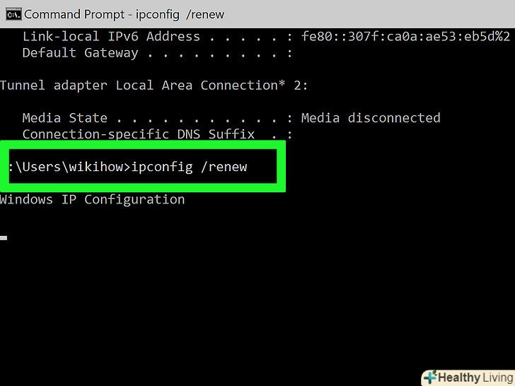 Введіть команду "renew". введіть ipconfig /renew . Комп'ютер отримає нову IP-адресу і підключиться до Інтернету.- Не дивуйтеся, якщо нова IP-адреса буде такою ж, як Стара-це означає, що найбільш підходящою IP-адресою для вашого комп'ютера є стара адреса.