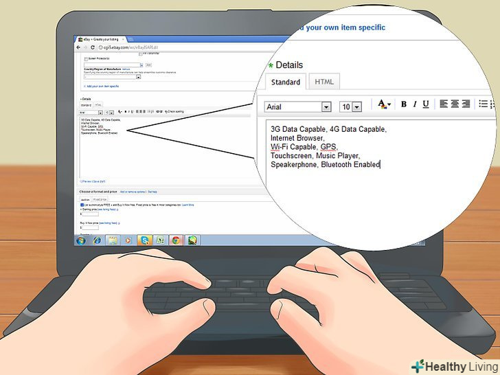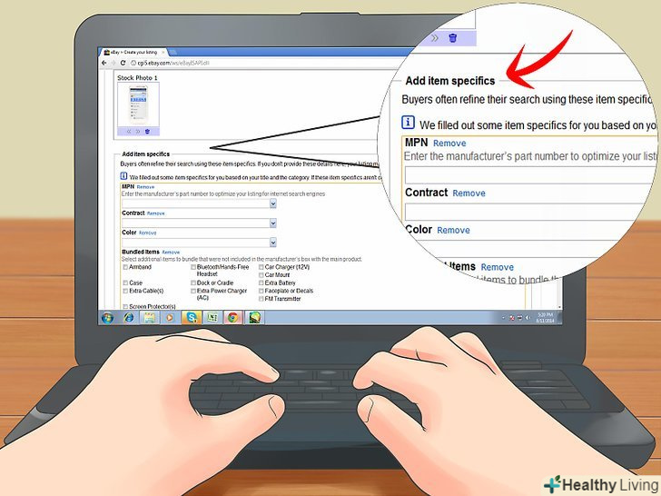 Введіть опис вашого товару. включіть в нього всю відповідну інформацію. Вона повинна включати в себе такі дані-виробника, Сумісність продукту (для товарів, які призначені для використання з чим-небудь ще), розмір, вага, колір, стан і так далі.- Краще надати занадто багато інформації, ніж занадто мало. Покупець може пропустити непотрібну йому інформацію, але, швидше за все, натисне кнопку «назад» якщо не знайде дані які йому потрібні. Додаткова інформація також допомагає пошуковим системам знайти ваше оголошення.