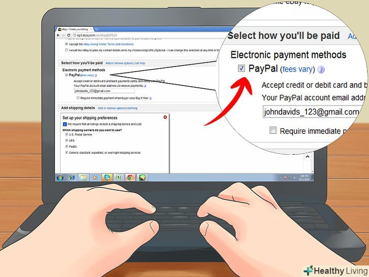 Встановіть форму оплати. компанія eBay пропонує великий вибір варіантів оплати для продавців і покупців, але поки найпопулярніший спосіб це Paypal. Створіть собі обліковий запис в Paypal, слідуючи за посиланням на сайті eBay або відразу на www.paypal.com.- Перевірте допустимі форми оплати в Умовах Користування eBay. [4]