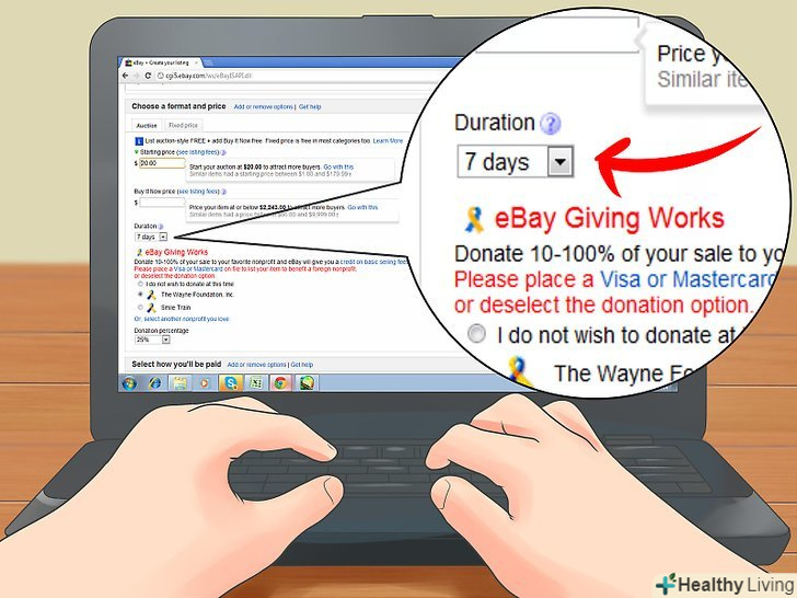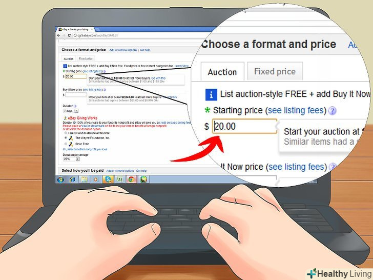 Призначте вашу ціну з урахуванням того скільки ви заплатили за товар, витраченого часу, зборів на eBay і вартості пересилання. Пам'ятайте, що як тільки хтось купує ваш предмет або аукціон закінчується, це означає Вашу згоду продати товар і цю угоду важко скасувати, якщо тільки обидві сторони не погодилися скасувати продаж. Прочитайте статтю про визначення ціни на ваші товари на eBay для більш детальної інформації.- Для товарів, що продаються за фіксованою ціною, є можливість поміняти ціну в будь-який момент. Для предметів, виставлених на аукціон, це можна зробити до надходження першої ставки.