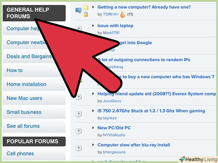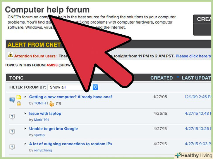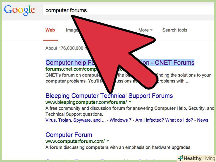 Знайдіть форум, на якому обговорюється ваша тема. введіть назву теми або галузі знань в пошукову систему Google, додавши слово "форум" в кінці запиту. Наприклад, якщо вам потрібна допомога з програмою Photoshop, напишіть в запиті "Photoshop форум".- Майже всі форуми вимагають реєстрації. Інакше вам задати питання не вдасться.