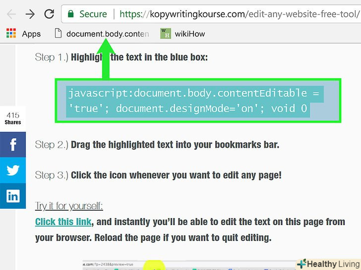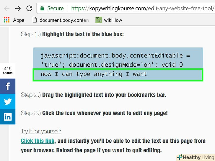 Використовуйте посилання. відкрийте сторінку, яку хочете змінити, і натисніть на закладку. І хоча це не принесе помітного ефекту, тепер ви зможете відкрити програмний код сторінки і відредагувати його на свій розсуд. [2]