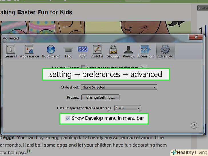Увімкніть меню "Розробка". Натисніть на меню «Safari» у верхній частині екрана. Виберіть "Налаштування«, а потім» Доповнення «з меню у верхній частині вікна»Налаштування". Установіть прапорець поруч із параметром "показувати меню" Розробка "у рядку меню" у нижній частині вікна. Меню "Розробка «з'явиться в рядку меню між опціями» Закладка «і»вікно". [5]