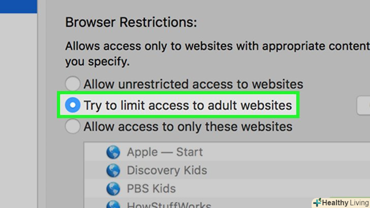 Натисніть «спробувати обмежити доступ до веб-сайтів для дорослих». ця опція знаходиться у верхній частині вікна. Так ви заблокуєте сайти для дорослих в Safari.