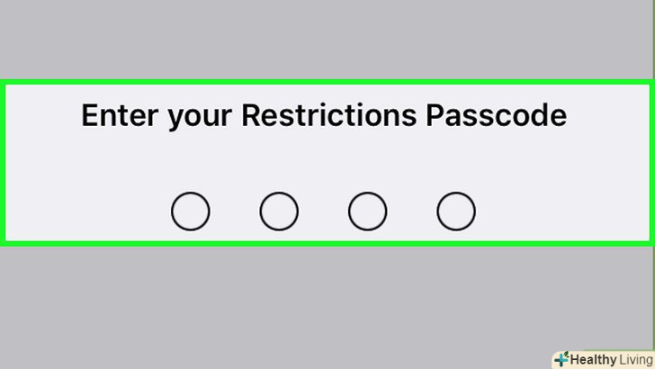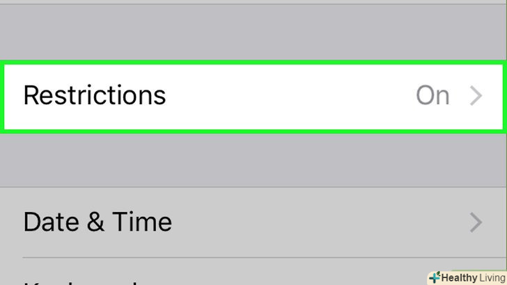 Прокрутіть вниз і натиснітьОбмеження . якщо на пристрої вже включені обмеження, система запропонує ввести пароль.- Якщо обмежень ще немає, натисніть "Включити обмеження", створіть код доступу, а потім пропустіть наступний крок.