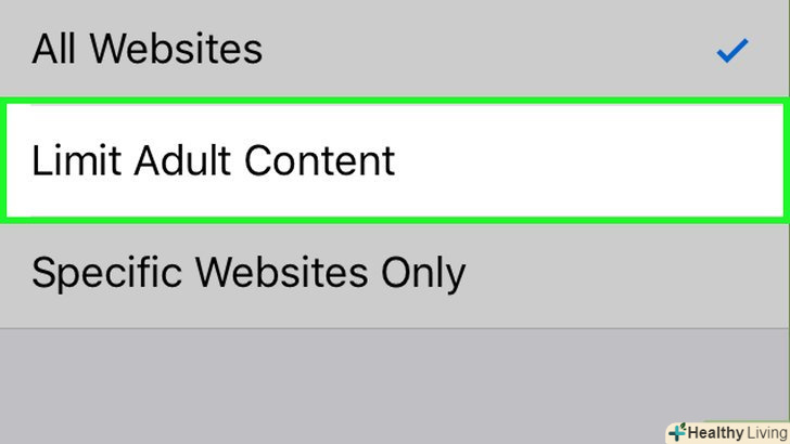НатиснітьОбмежити доступ до сайтів для дорослих . ця опція знаходиться у верхній частині екрана; праворуч від опції відобразиться синя галочка.