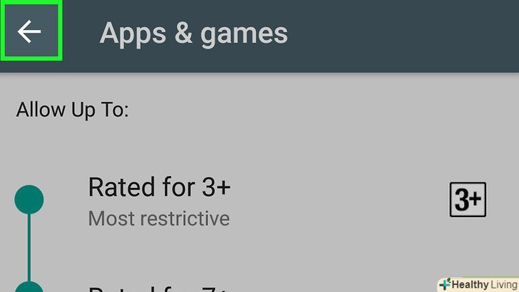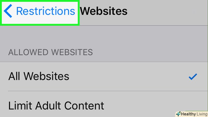 Натисніть кнопку "Назад". вона знаходиться у верхньому лівому кутку екрану. Внесені зміни будуть збережені, а власник пристрою не зможе відкрити сайти для дорослих в браузері Safari.- Також рекомендуємо поставити повзунок у опції «встановлювати додатки» в положення «вимкнути». Так власник пристрою не зможе встановити інший браузер і відкрити сайти для дорослих.