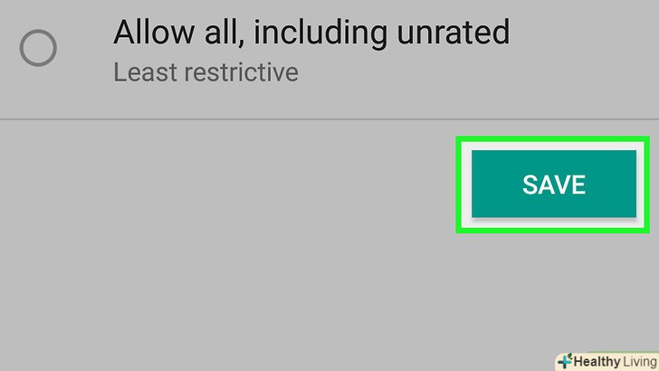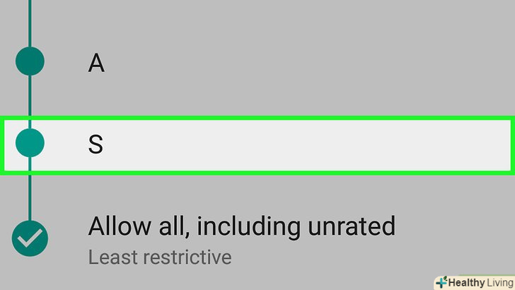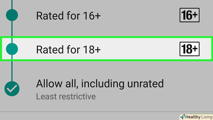 Поставте прапорець біля допустимого рейтингу. найвищий рейтинг – це «3+», коли заблоковані практично всі сайти, а найнижчий – «дозволити все». Поставте прапорець у «3+», «7+» або «12+».
