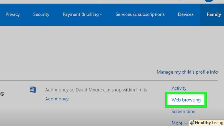 Клацніть по посиланню familysafety.live.com. вона знаходиться посередині сторінки. Відкриється веб-сторінка з налаштуваннями вибраного облікового запису.