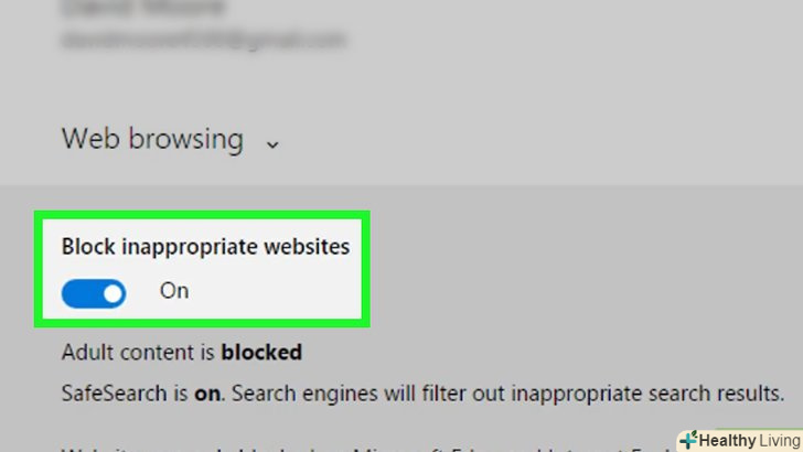 Клацніть по повзунку у опції «блокувати неприйнятні веб-сайти». він знаходиться в розділі «Перегляд веб-сторінок» у верхній частині сторінки. Так ви заблокуєте сайти для дорослих в Microsoft Edge і Internet Explorer, а також на будь-яких підключених пристроях (наприклад, Xbox One).