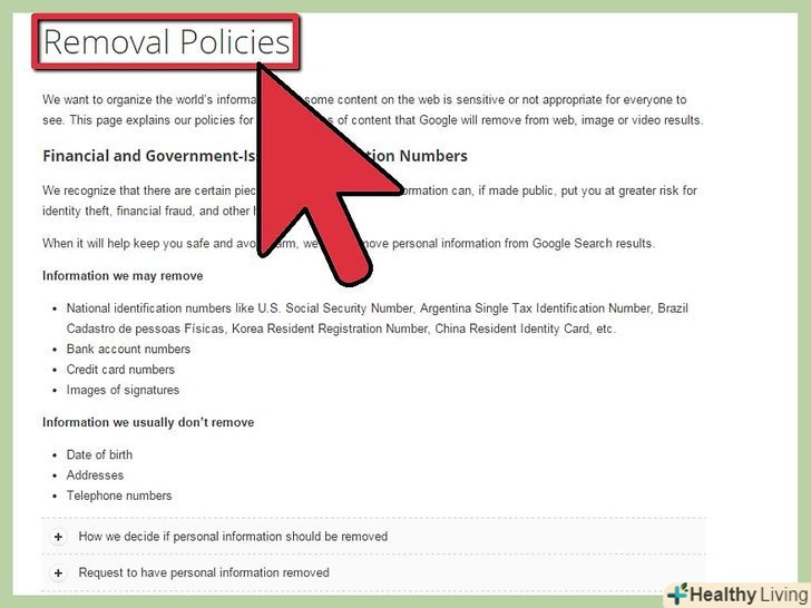 Запит на видалення вмісту з Google. звичайно, ця пошукова система дуже рідко щось видаляє, звичайно, якщо це не суперечить їх правилам користування. Наприклад, Google може видалити такі речі, як дані членів уряду, інформація про сплату податків, дорослий контент і так далі.- Якщо інформація відображається в пошукових результатах, ви можете заповнити форму, яку надає Google: https://support.google.com/websearch/answer/2744324