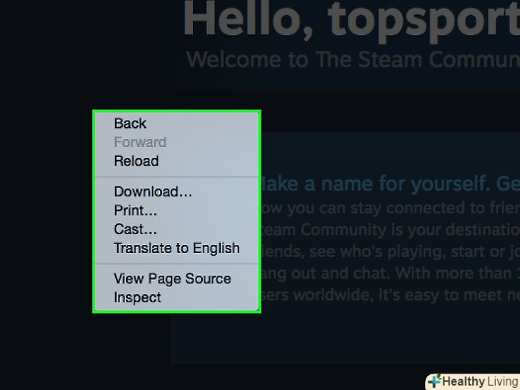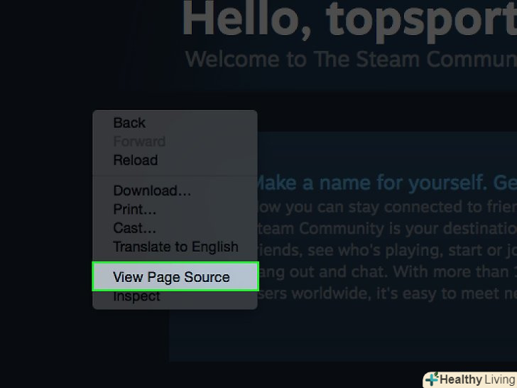 Натисніть на опціюВихідний код сторінки . ця опція знаходиться в випадаючому меню. Вибравши її, ви відкриєте нову вкладку з HTML кодом сторінки Steam.- Також Станицю з вихідним кодом можна відкрити, затиснувшиCtrl (або ⌘ Command + ⌥ Option на Мас) і натиснувши U . Ця комбінація клавіш працює в більшості браузерів, включаючи Microsoft Edge і Safari.