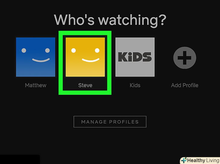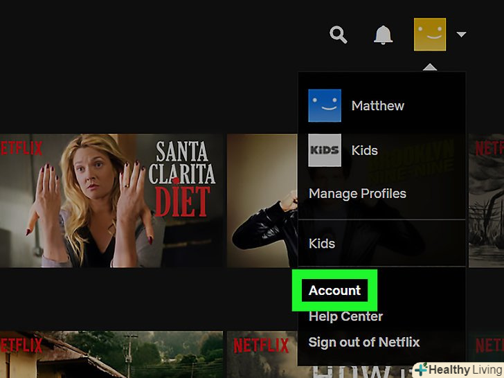 Виберіть свій профіль. клацніть по значку і імені свого профілю Netflix.- Якщо у вашому обліковому записі Netflix є лише один профіль, пропустіть цей крок.