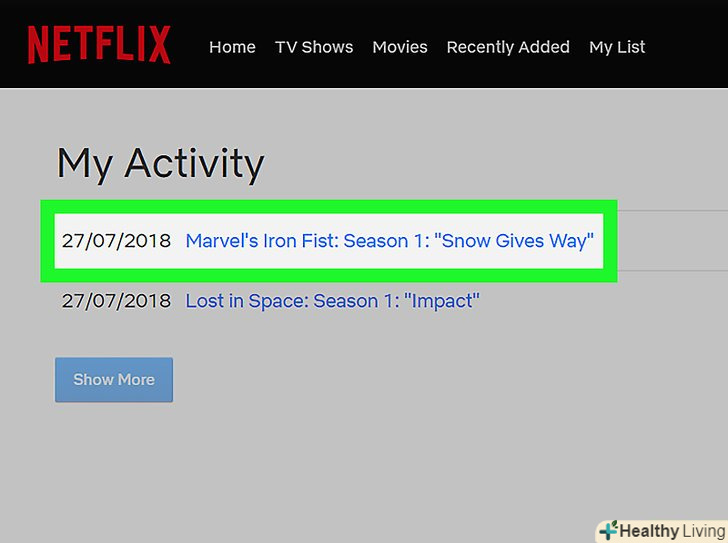 Знайдіть фільм або епізод, який ви хочете видалити. для цього прокрутіть історію перегляду вниз.- Прокрутіть список до кінця і натисніть «Show more» (показати ще), щоб переглянути старіші записи.