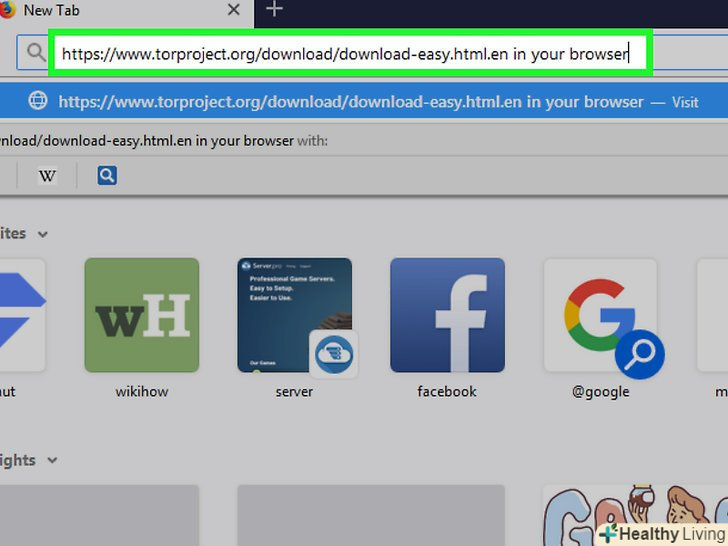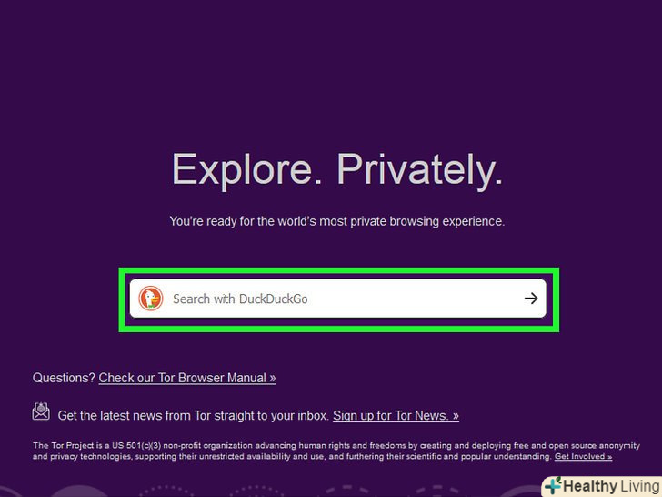 Відкрийте заблокований сайт. для цього використовуйте текстове поле посередині сторінки привітання Tor. Оскільки в Tor вбудований проксі-сервер, в цьому браузері можна відкрити будь-який сайт.- У текстовому полі посередині сторінки використовується пошукова система DuckDuckGo.