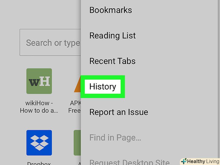 НатиснітьІсторія . ви знайдете цю опцію посередині меню.- Якщо опції «історія» немає в списку, натисніть «Нова вкладка» в меню, а потім торкніться «⋮» і натисніть «історія».