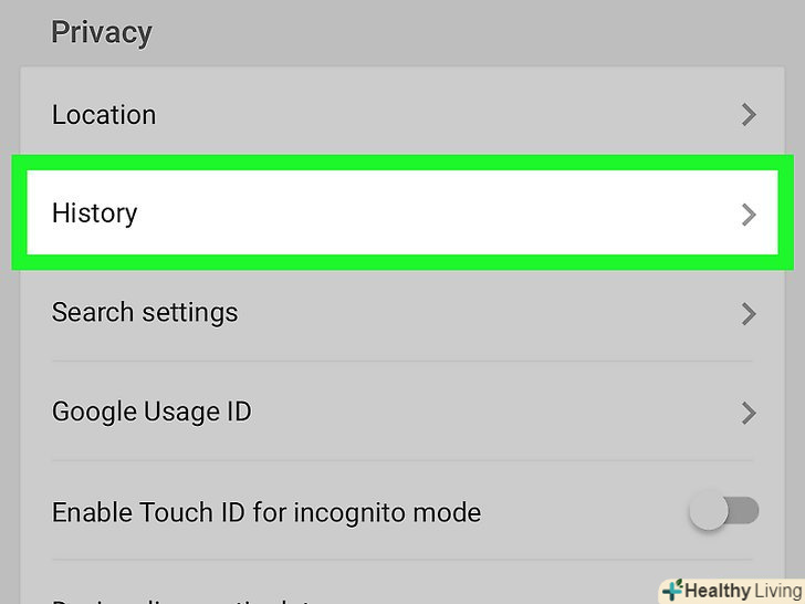 Прокрутіть вниз і натиснітьІсторія . ця опція знаходиться посередині сторінки.