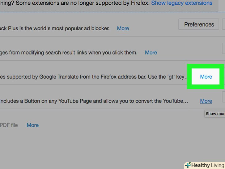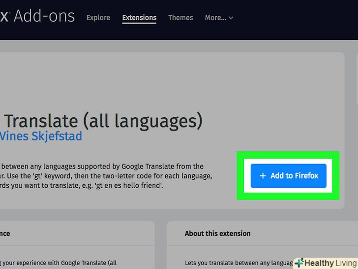 Натисніть на "Детальніше", щоб дізнатися більше інформації про кожне Доповнення. ось кілька добре зарекомендували себе доповнень-перекладачів для Firefox: Google Translator від nobzol, Translate This від Bradley Rosenfeld, translator від Byron Adams І Fast Translation від Tomek Wasiak. [4]