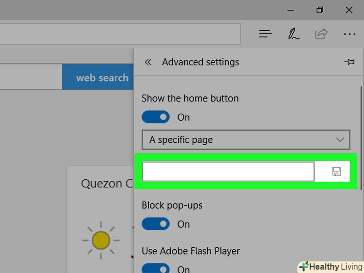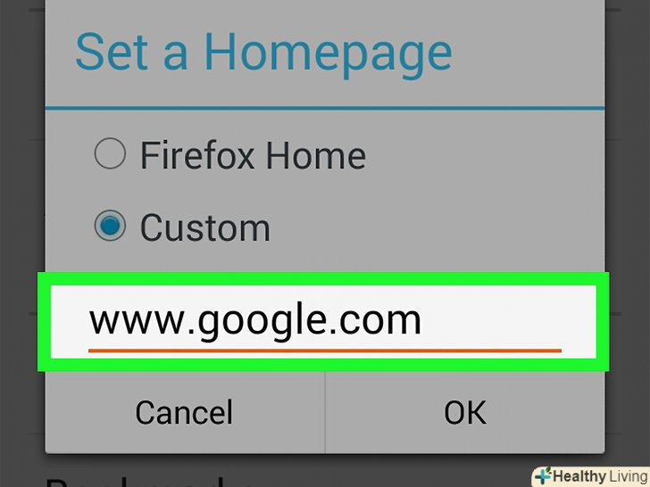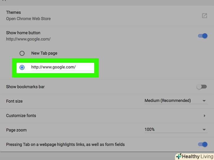 Введіть www.google.com у рядку «введіть веб-адресу». вона знаходиться під опцією «сторінки швидкого доступу», яка розташована в нижній частині розділу «показувати кнопку „Головна сторінка“».- Можливо, в цьому рядку вже буде веб-адреса. В цьому випадку видаліть його і введіть потрібний.
