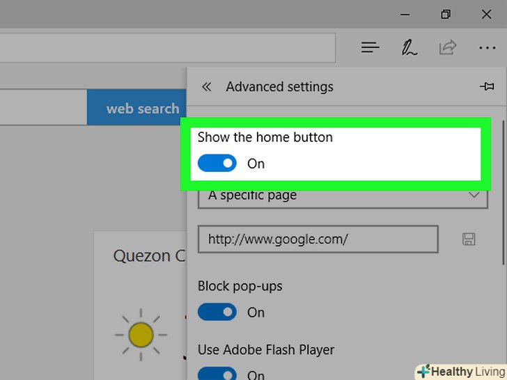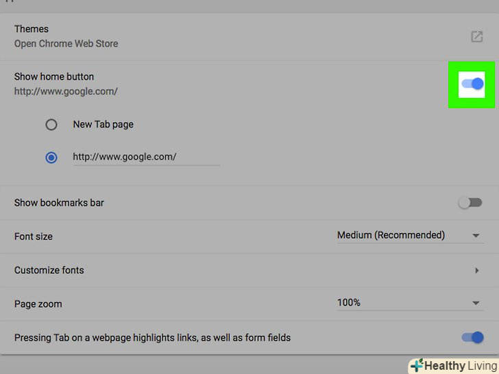 Натисніть на повзунок уВідображати кнопку "Додому" . він знаходиться вгорі меню «Зовнішній вигляд». Так ви активуєте кнопку "додому" - вона з'явиться зліва від адресного рядка і буде відзначена значком у вигляді будиночка.- Якщо у повзунка ви бачите слово "включити«, кнопка» додому" вже включена.