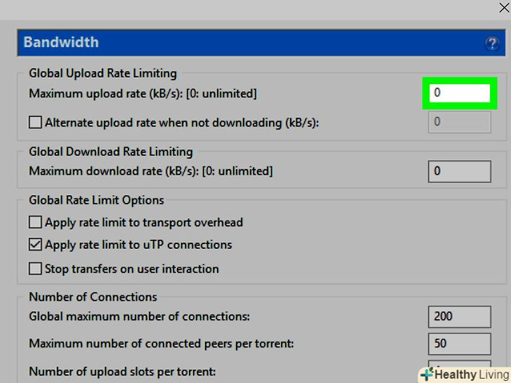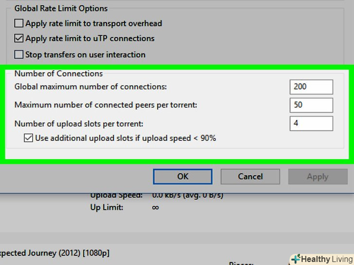 Змініть кількість можливих підключень.так ви будете не тільки роздавати файли (тобто не зіпсуєте репутацію в співтоваристві торрент-користувачів), але і забезпечите пристойну швидкість скачування:- У текстовому полі у» Максимум з'єднань " введіть 150 (або менше);