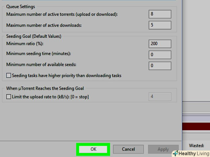 Клацніть поOK.ця кнопка знаходиться в нижній частині вікна. Налаштування будуть збережені; тепер торрент-файли будуть завантажуватися з урахуванням оптимізованих налаштувань.- Можливо, вам доведеться перезапустити uTorrent або BitTorrent, перш ніж внесені зміни вступлять в силу.